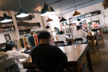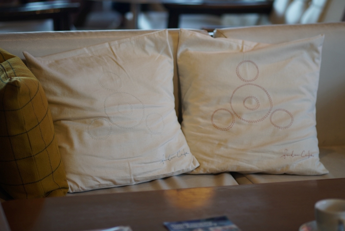 フダンカフェのソファにあるTERASの刺し子入りクッション