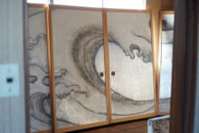 展示は壁画のほか、ふすま5枚を連ねた障壁画、階段展示などを含む約17点で構成する。