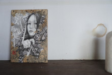 竹内さんは子どもの頃から絵を描くことが好きで、美大進学に憧れ高校では美術部に所属し油絵を描いていた。進路に悩んでいた時、教諭に連れて行ってもらった「上村松園展」で、日本画特有の線やぼかしの美しさに強く心を打たれ、日本画の道を志したという。文星芸術大学で日本画を専攻し、卒業後は仕事をしながら描く活動を続け、母となり「竹内水凪藻」と名乗ってからは今回が初の個展となる。