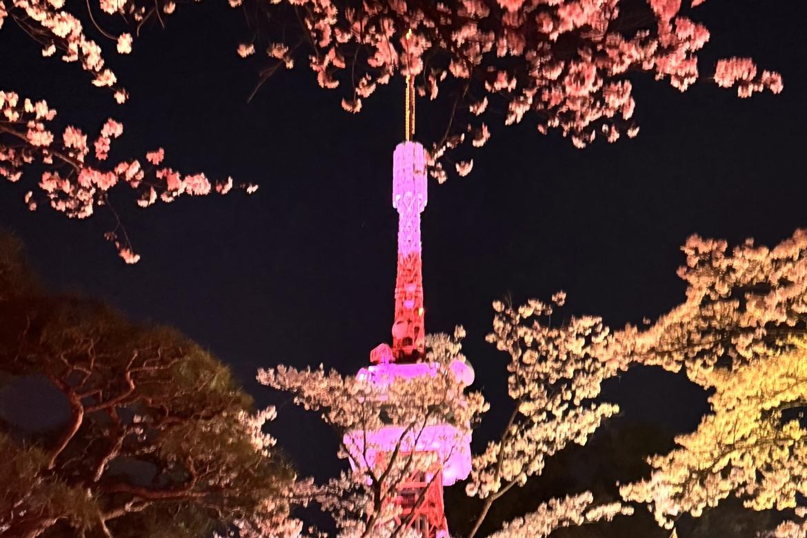 八幡山公園のぼんぼりが点灯され、桜を照らす様子