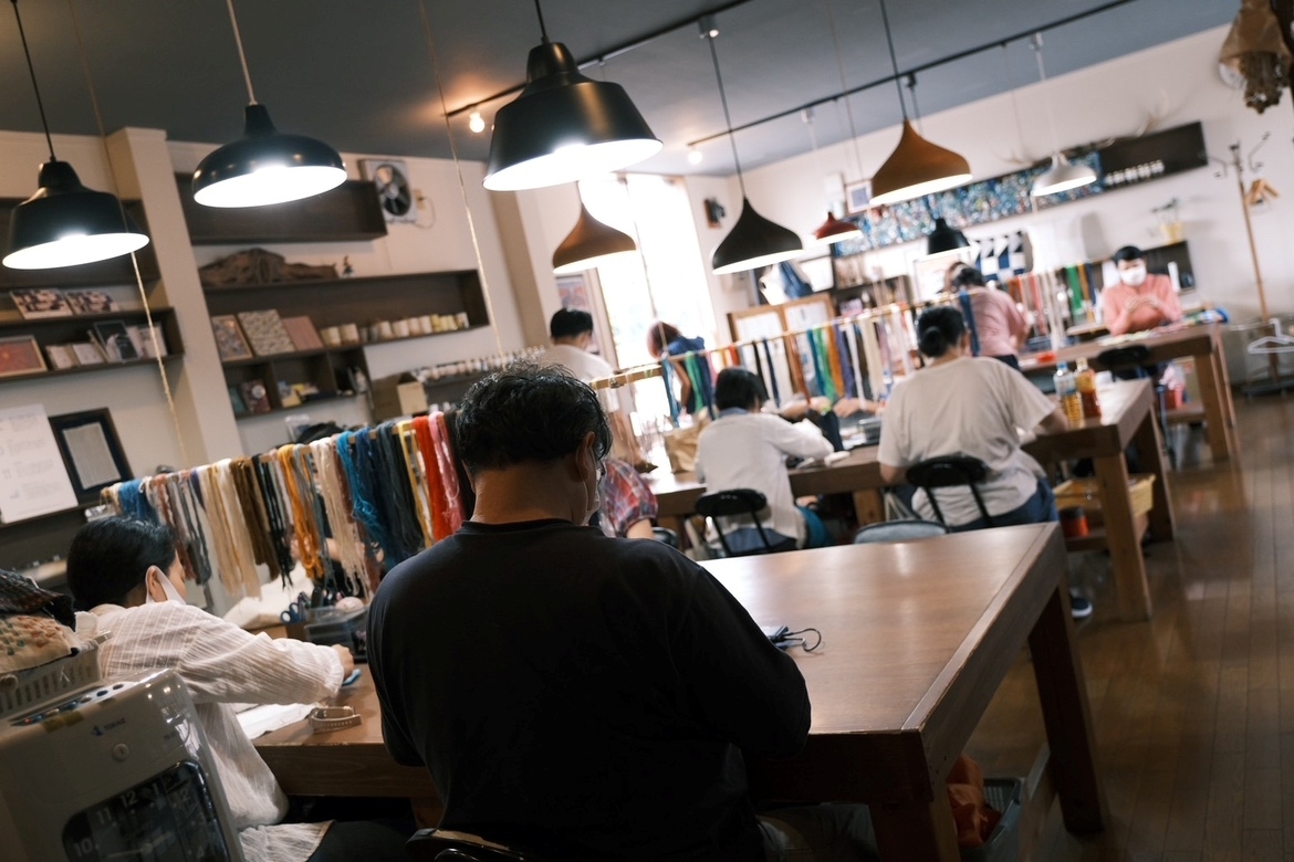 フダンカフェのソファにあるTERASの刺し子入りクッション