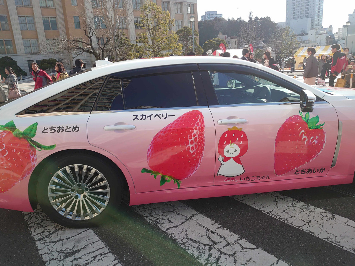 創立80周年記念事業の一環で新型「いちごクラウン」を製作した栃木トヨタ自動車(宇都宮市横田新町)が1月18日、栃木県庁前で開催される「いちご王国・栃木の日」記念イベントで車両を披露した。