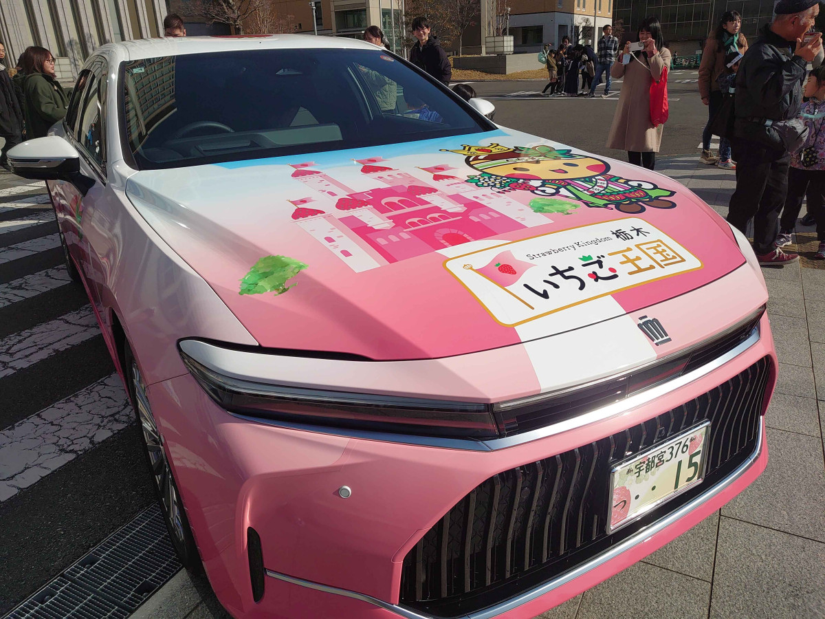 創立80周年記念事業の一環で新型「いちごクラウン」を製作した栃木トヨタ自動車(宇都宮市横田新町)が1月18日、栃木県庁前で開催される「いちご王国・栃木の日」記念イベントで車両を披露した。